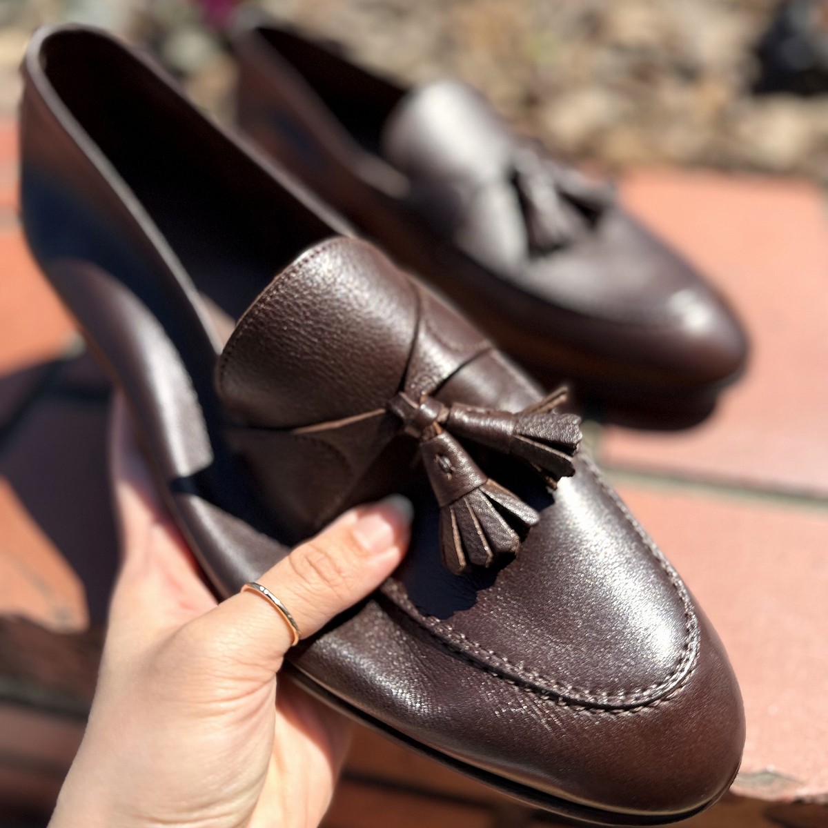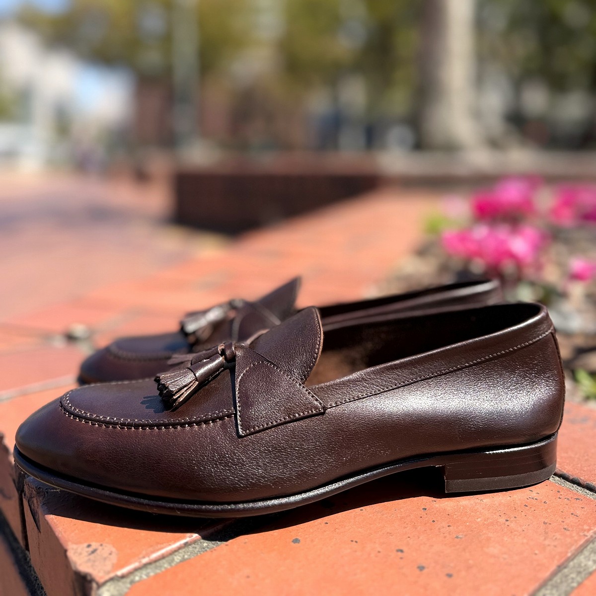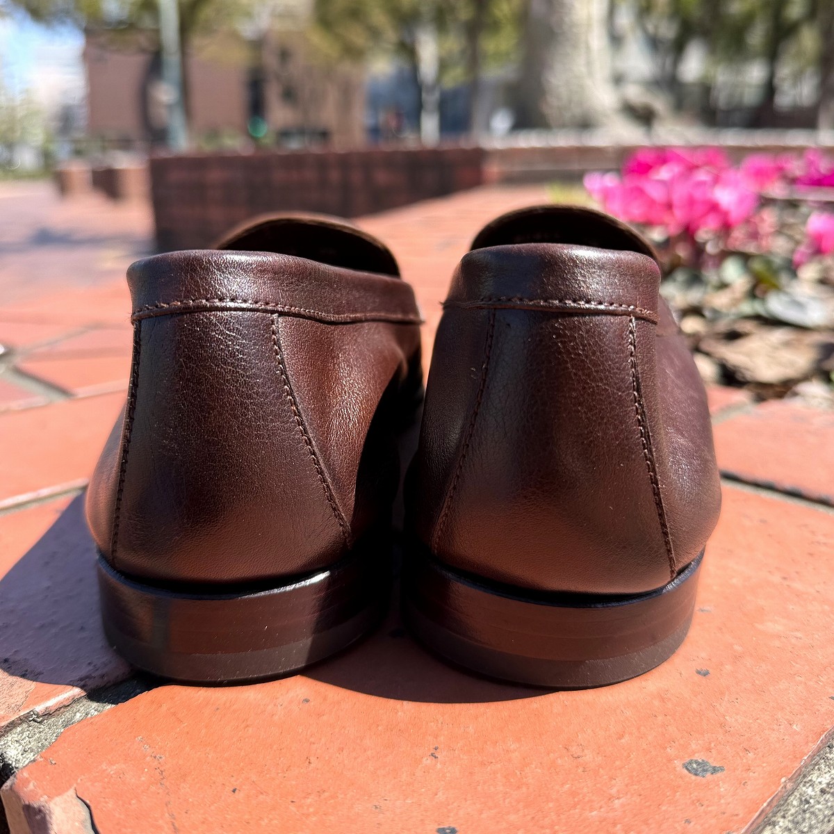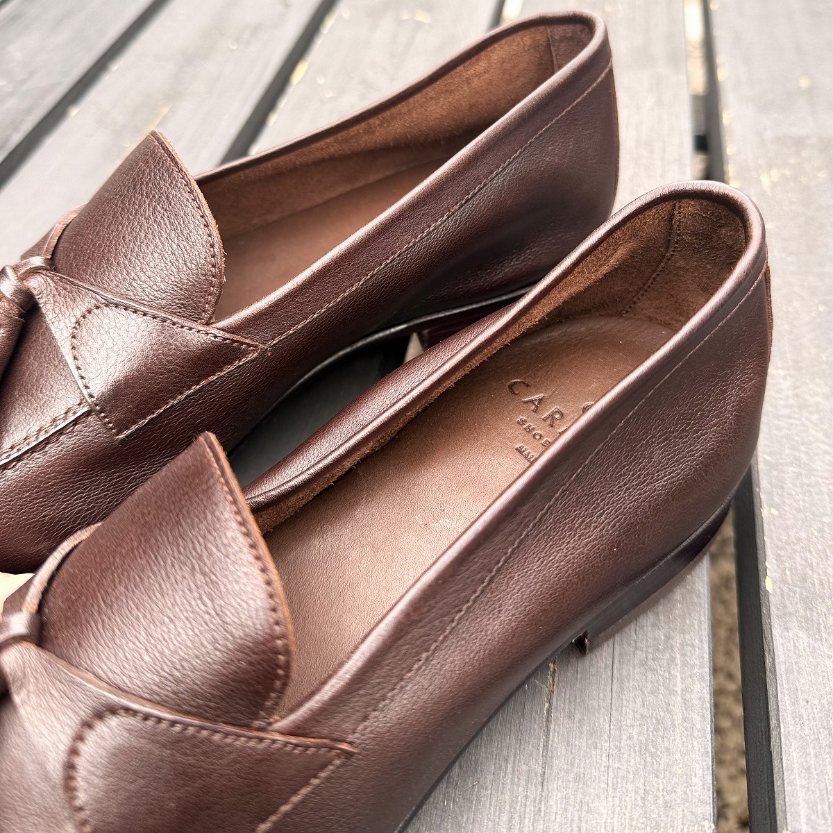 履き口をくるりと革紐で編んだタッセルローファーに比べて甲部分のみの装飾でスッキリした印象です。