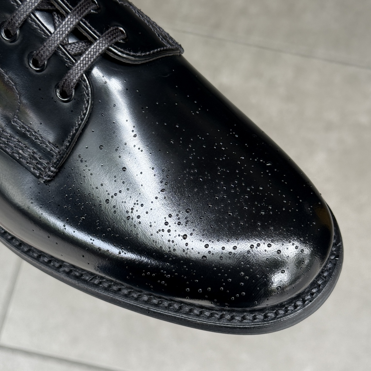 カーフの表面を樹脂でコーティングした「ポリッシュドレザー」(ガラスレザー)を使用しているため独特の光沢感があり、耐水性にも優れています。