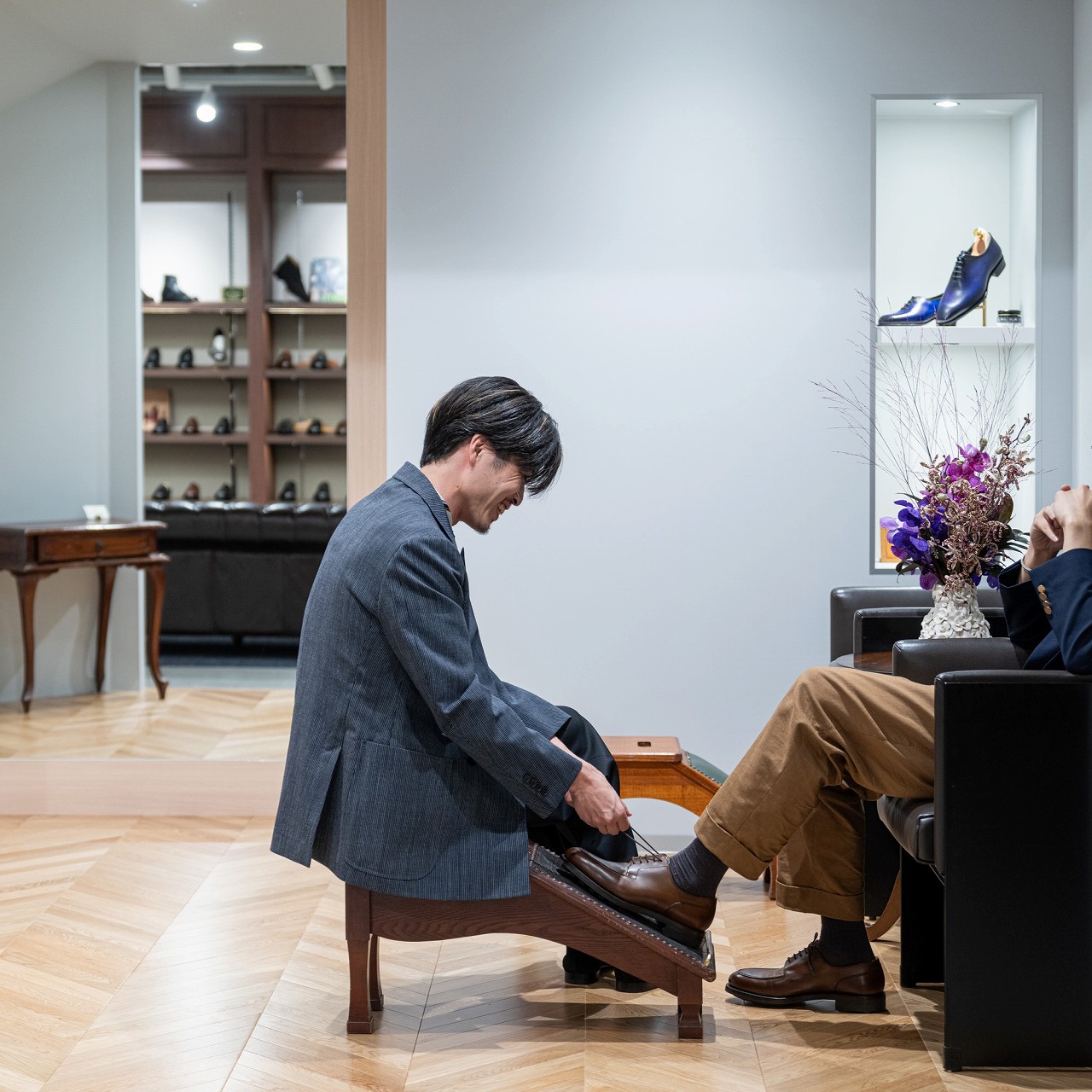 新たに設置したフィッティング専用ステージでは、靴を履いてステージに立ち、全身のバランスや立ち姿を客観的に確認しながら、スタッフとともに理想の一足をお選びいただけます。