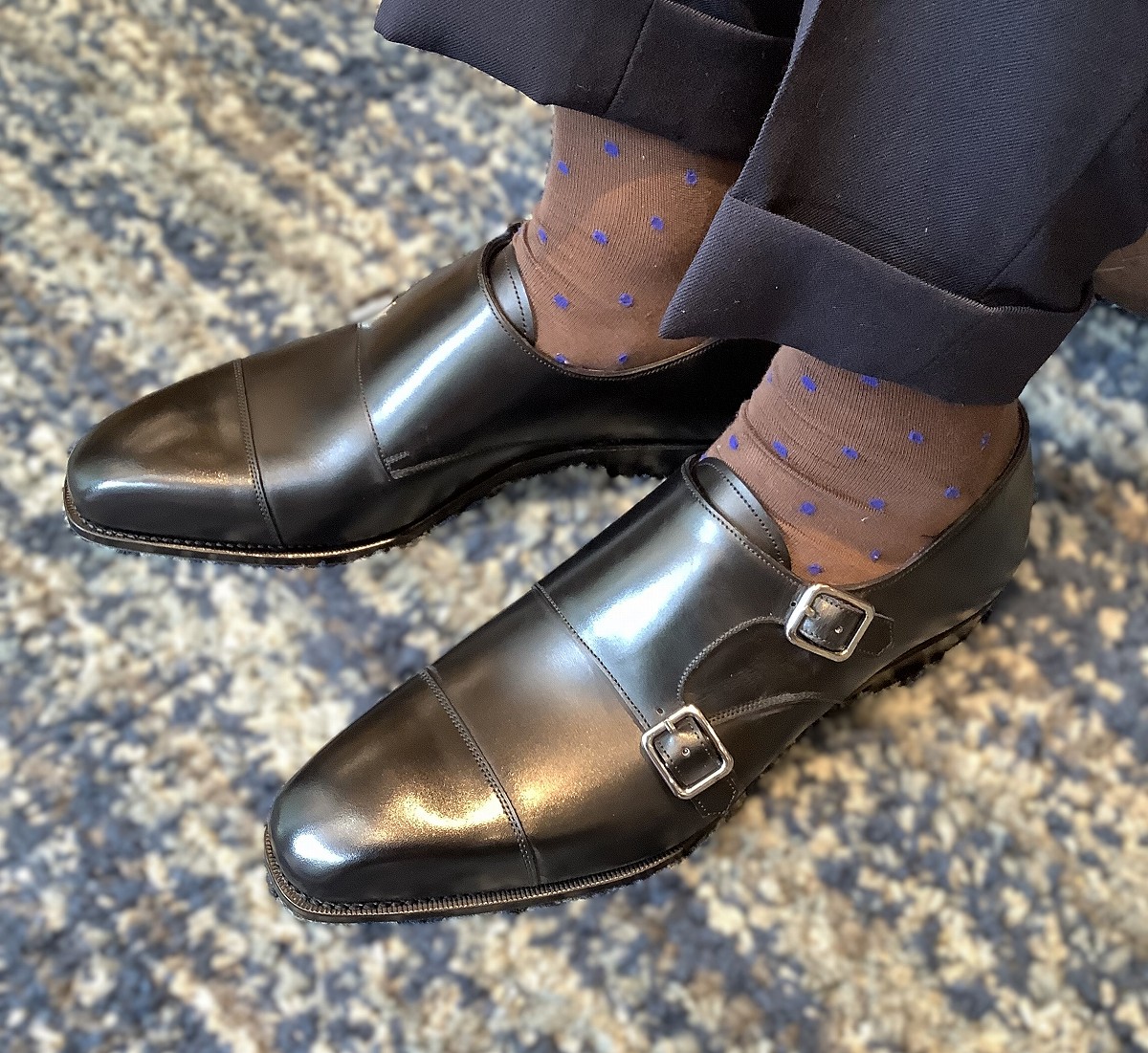 ビジネスシーンで1足持ってると重宝するブラックカーフ。着脱も楽でエレガント。