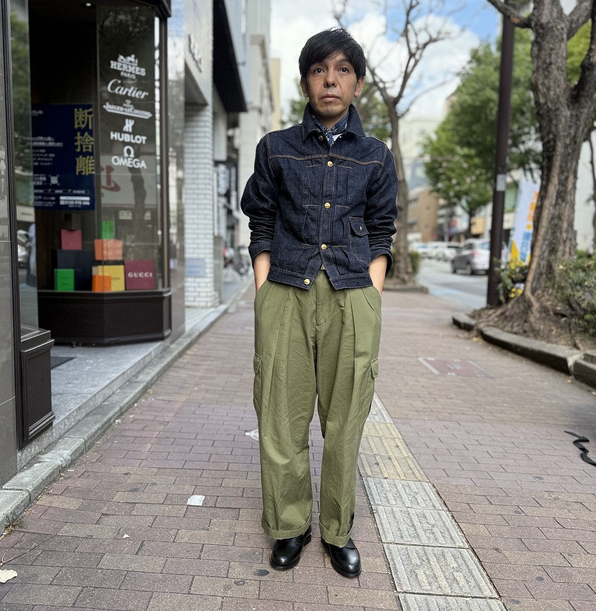 トラッカージャケット×ミリタリーパンツでコーディネート。