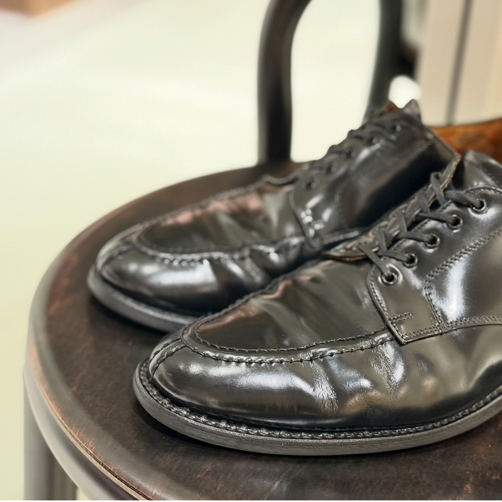 装飾のないプレーントゥ、羽根部分に施されたピューリタンステッチと堅牢な作りは、ミリタリーテイスト。