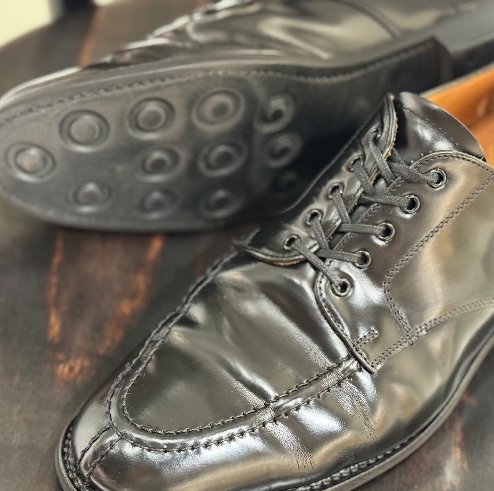 今では希少な3本針ミシンを使用して縫われたピューリタンステッチと呼ばれる特徴的な3本のステッチラインがつま先と羽根部分に施された同ブランドのアイコニックなモデル。