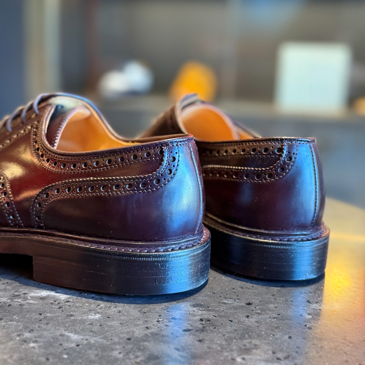 バーガンディーコードバンは光の加減で赤みが現れたり、深いブラウンに見えたりと表情が豊かです。