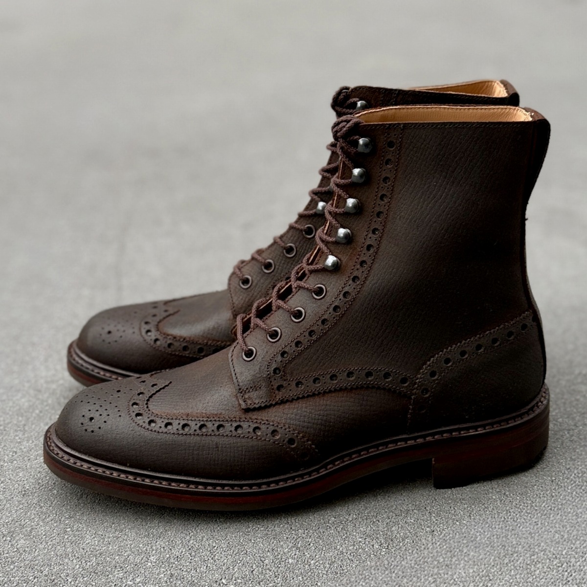 フルブローグ(ウィングチップ)のレースアップスタイルで、カントリーブーツを象徴するデザインです。
