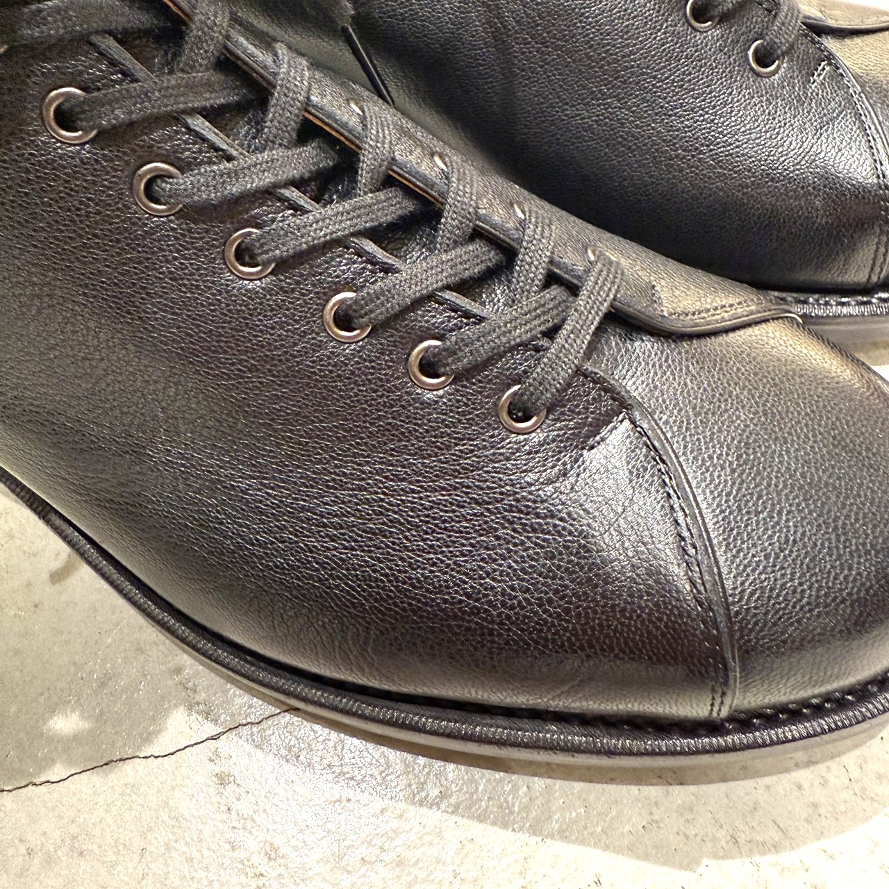 アッパーには、足馴染みの良いソフトなボックスカーフを使用。きめが細かく、落ち着いた光沢を持つレザーで、履き込むほどに艶が増していきます。日々のお手入れによって表情が育っていくのも、この素材ならではの楽しみです。