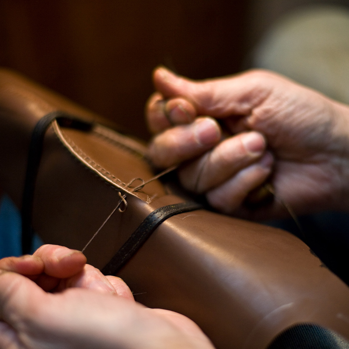 猪毛は硬さを持ちながらもしなやかで、レザーの中を自由に弧を描きながら進むことができるため、このステッチには欠かせないものです。