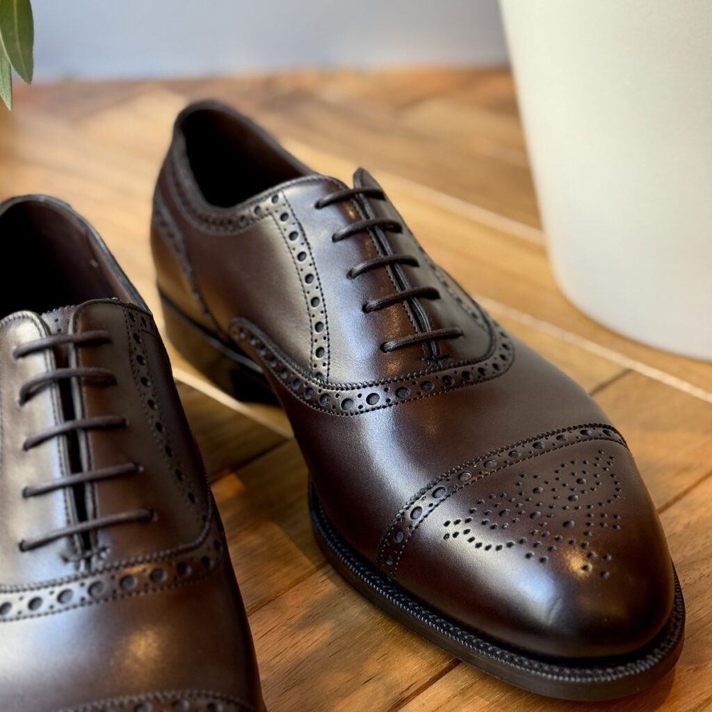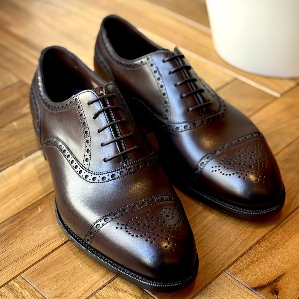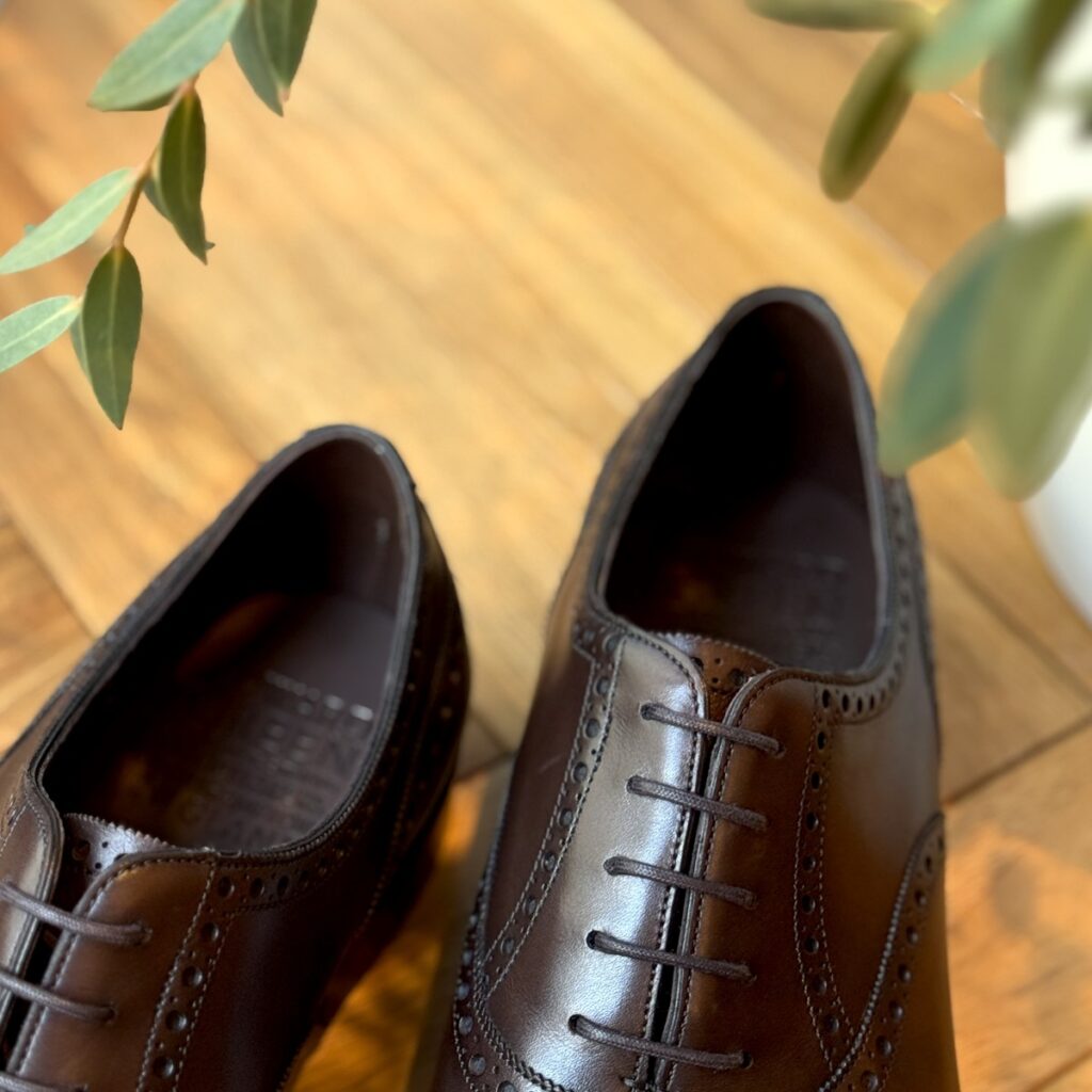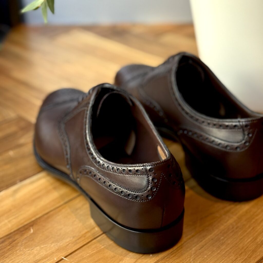 フルブローグ(ウィングチップ)ほど派手さやカジュアルな印象ではなく、ストレートチップほどカチッとかしこまらない、普段のビジネスシーンではとても使える絶妙な立ち位置にいるデザイン。