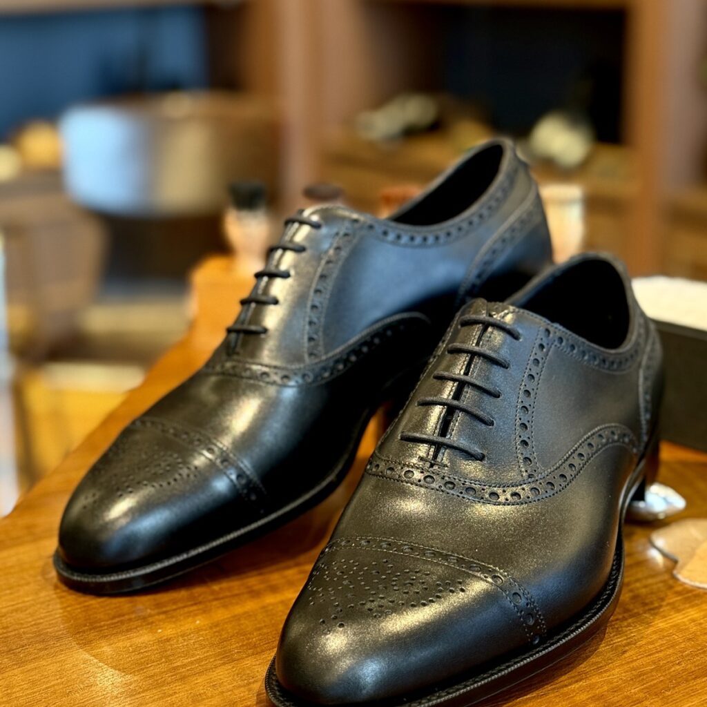 靴全体に穴飾り(パーフォレーション)が施されていて、つま先は一文字のデザイン。一文字のキャップにはメダリオンの穴飾り。